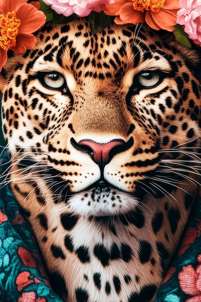 Ein majestätischer Leopard strahlt in lebendigen Farben, gekrönt von zarten Blumen und eingehüllt in einen floralen Schal. Dieses faszinierende Kunstwerk verleiht jedem Raum eine exotische Note und vermittelt einen Hauch von Wildheit, perfekt für ein stilvolles Wohnzimmer oder ein einladendes Arbeitszimmer. Die Harmonie von Natur und Eleganz fängt Blicke und Herzen gleichermaßen ein.