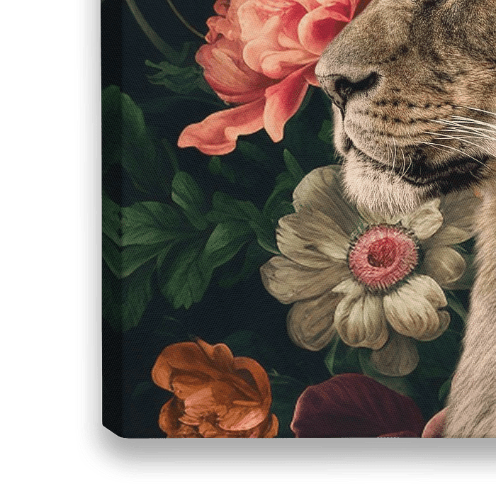 Porträt eines Löwen und Löwin mit einem Vintage-Blumen-Hintergrund verschmolzen Warme Farben, beige, braun, gelb, rosa Schön in einem klassischen, warmen oder chic Interieur Digital Art