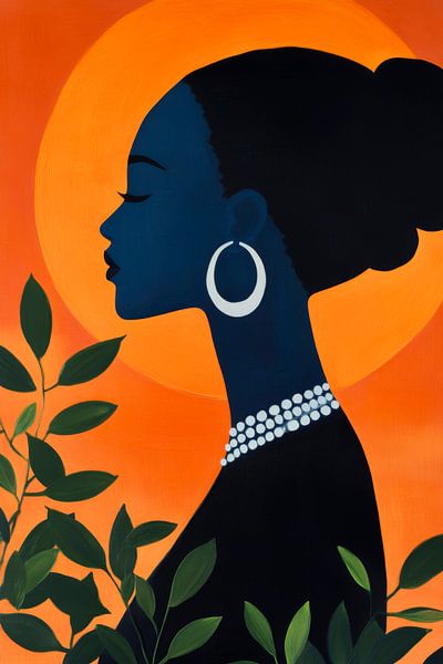 Das Bild zeigt die elegante Silhouette einer Frau vor einem strahlend orangen Hintergrund. Ihr Haar ist zu einem schicken Knoten gebunden, und sie trägt auffällige, große Ohrringe sowie eine Perlenschnur um den Hals. Das Spiel von Licht und Schatten verstärkt ihre Anmut, während die grünen Blätter eine stilvolle Verbindung zur Natur…