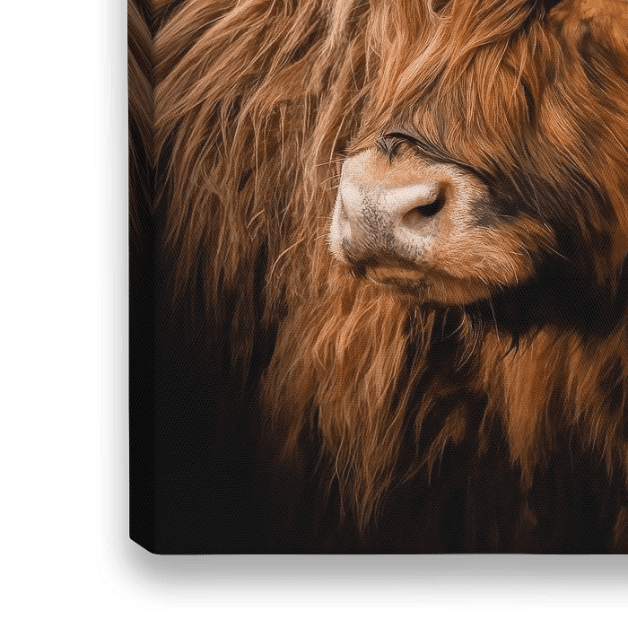 Porträt einer schönen schottischen Highlander-Kuh, digital verbessert mit einem warmen olivfarbenen Hintergrund