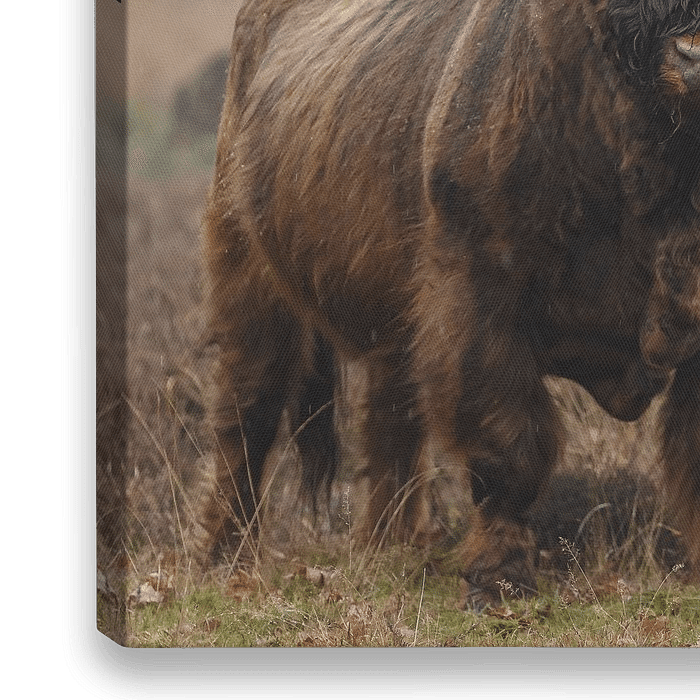 Ein schottischer Highlander-Stier steht auf dem Veluwezoom in einem Regen, der sanft auf sein behaartes Fell fällt. Hart im Nehmen steht dieser große Junge in der Landschaft.