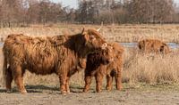 Ein schottischer Highlander mit seinem Kalb, im Naturschutzgebiet Huis ter heide in De Moer in den Niederlanden. Das Gebiet wird von Natuurmonumenten verwaltet.