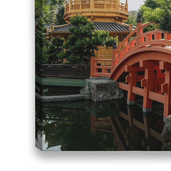 Gelber Schrein und orangefarbene Brücke im Nan Lian-Garten in Hongkong am Abend an einem halb bewölkten Tag. Neben dem Chi Lin-Kloster gelegen.