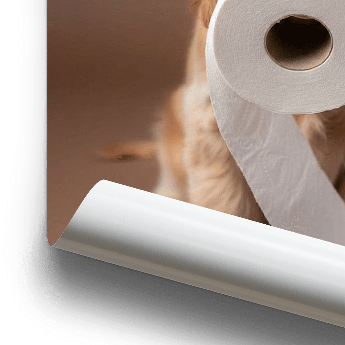 Eine bezaubernde Nahaufnahme eines jungen Spaniels mit einer Toilettenpapierrolle im Maul. Seine großen, dunklen Augen blicken direkt in die Kamera – eine Mischung aus Unschuld, Neugier und vielleicht ein bisschen Unfug.