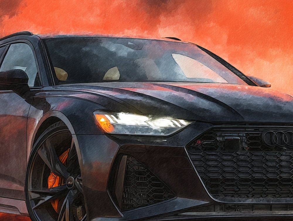 Ein glänzender, reiner Nachtschatten umhüllt den Audi RS6, seine Linien sind scharf wie Bleistiftstriche auf rauem Papier. Der imposante Kühlergrill schimmert in silbernen Schatten, der breite Heckspoiler wölbt sich in dynamischem, schwungvollem Grau und Schwarz. Die beleuchteten Scheinwerfer blinken wie Neon-Akzente, und die sportlichen Felgen drehen sich in einem wirbelnden, skizzenhaften Muster. Diese dunkle Kraft strahlt Geschwindigkeit, Eleganz und rohe Kunst aus.