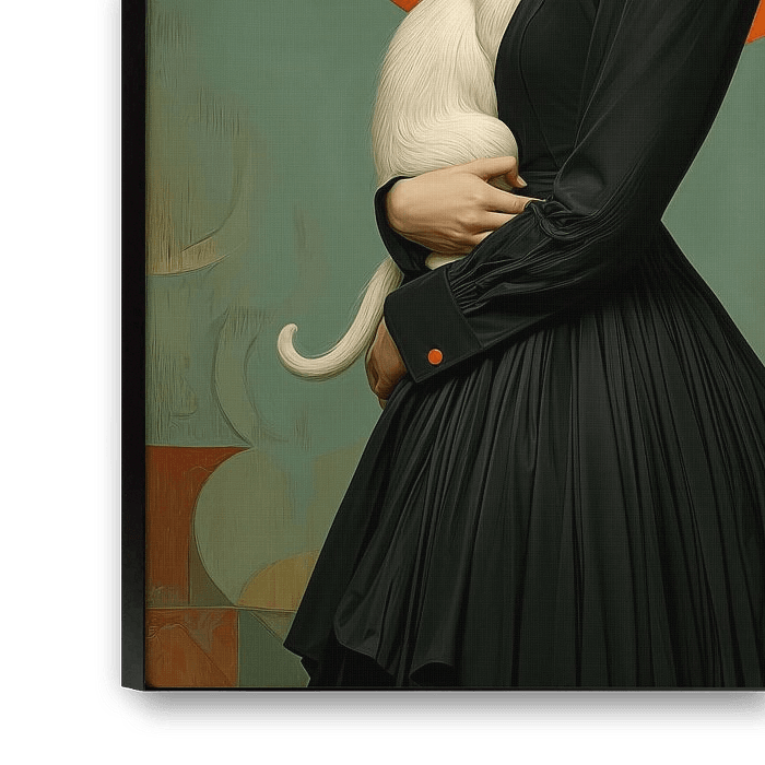Ein neoklassizistisches Porträt zeigt eine junge Frau in einem eleganten schwarzen Kleid im viktorianischen Stil vor einem eindrucksvollen orangefarbenen Kreis. Der Kontrast zwischen der eleganten schwarzen Silhouette und der makellosen weißen Katze in ihren Armen erzeugt eine geheimnisvolle, fast übernatürliche Atmosphäre. Die Komposition strahlt Ruhe und Eleganz aus, während die Farbpalette aus Schwarz, Weiß und Orange vor türkisfarbenem Hintergrund eine starke visuelle Wirkung erzielt.