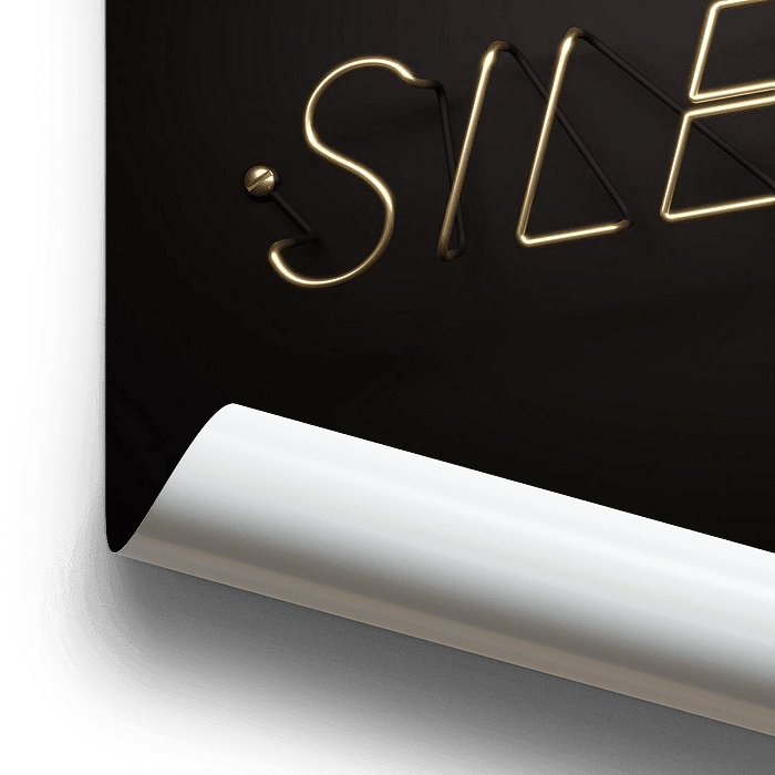 Das Wort "Silence" in Buchstaben aus goldenem Draht.