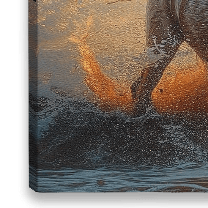 Drei Pferde galoppieren bei Sonnenuntergang durch das schäumende Meer, ihre Mähnen flattern im Wind. Der Himmel ist mit dramatischen Wolken gefüllt, die in warmen Farbtönen leuchten und die lebendige Energie der Szene widerspiegeln. Das Wasser plätschert um die Pferde herum und vermittelt ein Gefühl von Freiheit und Bewegung.