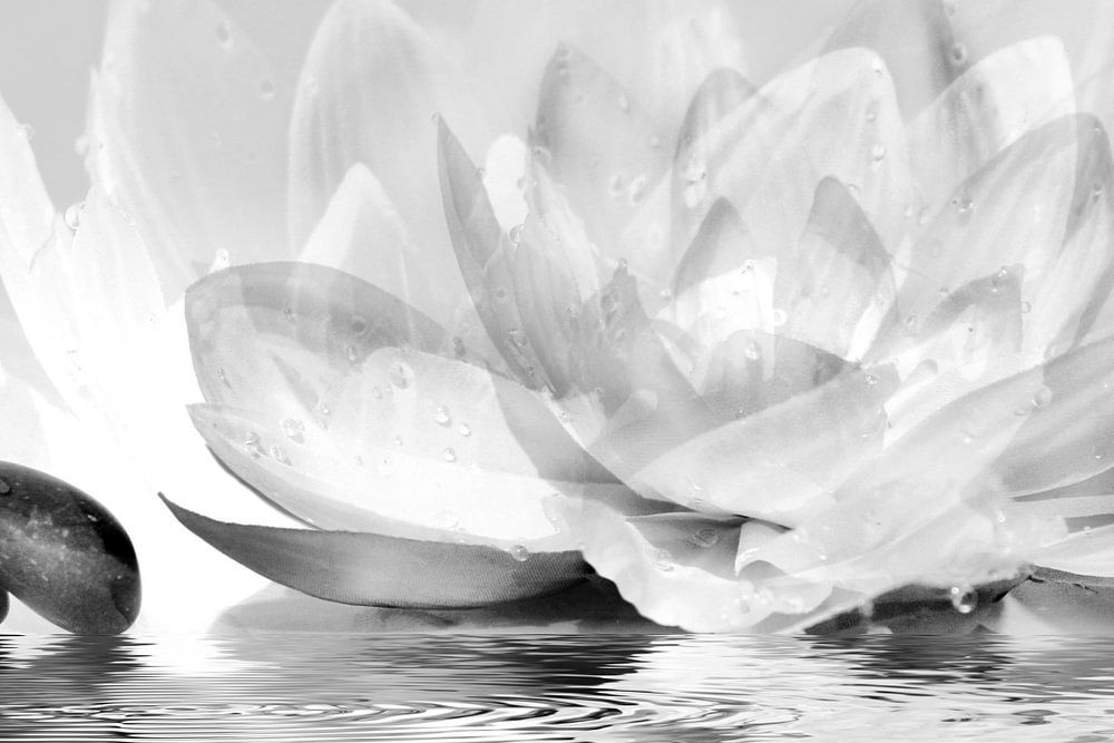 Komposition von Seerose und Kieselsteine in schwarz und weiß mit Reflexionen