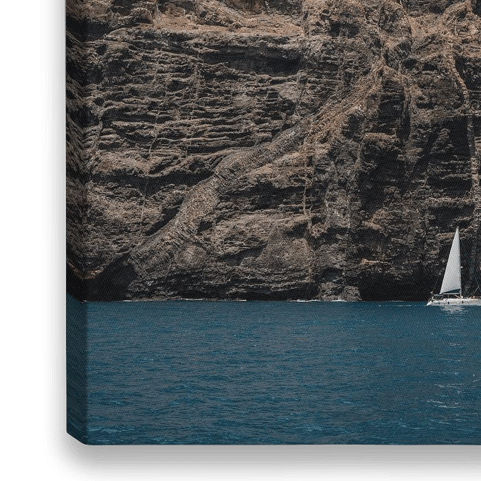 Ein Segelboot segelt vor den hohen Klippen von Los Gigantes auf Teneriffa. Vulkanische Berge auf der Südseite der Kanareninsel.