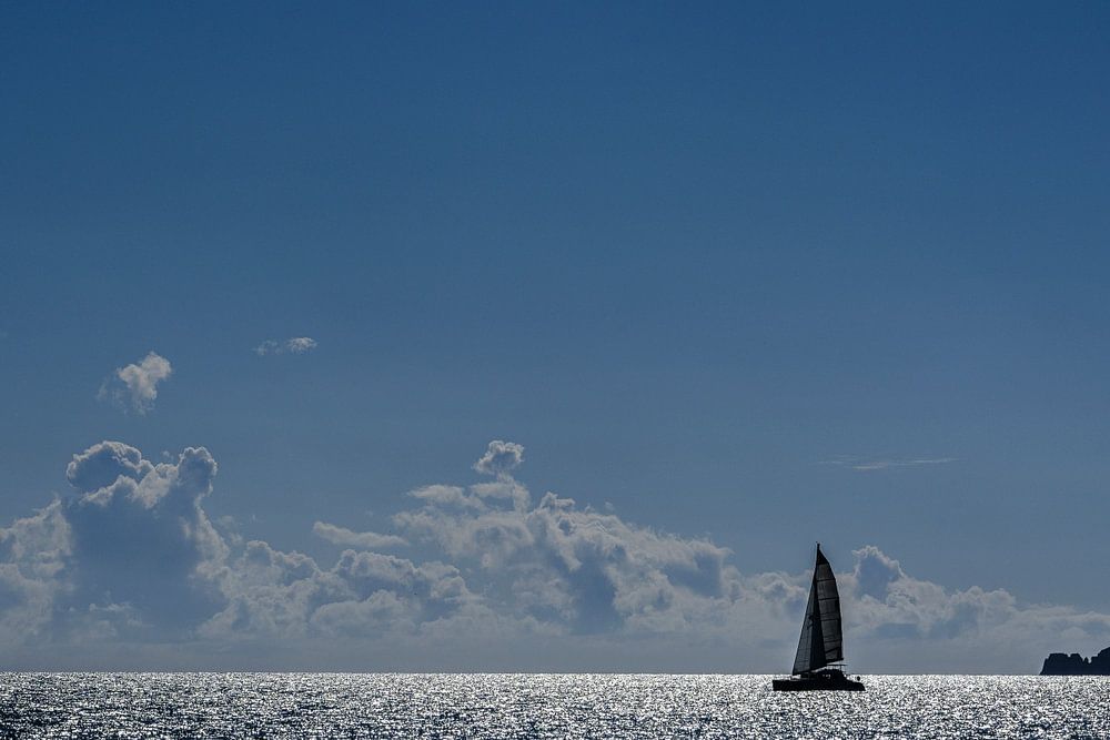 Segelboot vor der Küste von Alvor, östlich von Lagos an der Algarve.