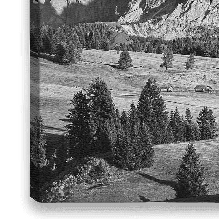 Ein Schwarz-Weiß-Foto der Seiser Alm, einer Hochebene der Dolomiten und der größten Hochalm Europas.