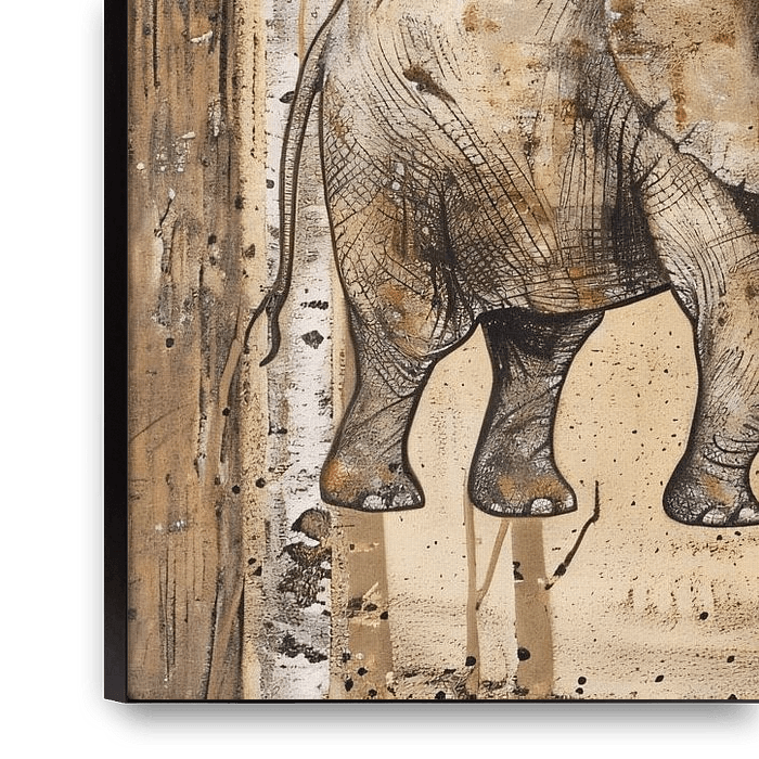 Dieses bezaubernde Kunstwerk fängt die zarte Bindung zwischen einer Elefantenfamilie vor dem Hintergrund natürlicher Holztöne ein. Die Sepia-Farben verleihen ihm einen antiken Charakter, während die durchdachte Platzierung der Figuren eine Geschichte von Einigkeit und Schutz vermittelt. Das Design balanciert zwischen der Stille der…