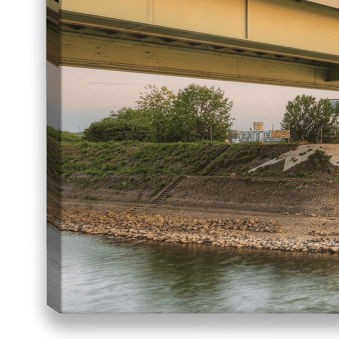 Blick von der Rheinpromenade zur Severinsbrücke bei Sonnenuntergang. Links im Hintergrund sind zwei der drei Kranhäuser zu sehen.