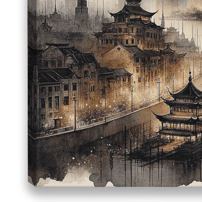 Das Bild präsentiert eine atmosphärische Darstellung Shanghais, wo historische Pagoden und moderne Wolkenkratzer nebeneinander existieren und sich im Fluss spiegeln. Der Oriental Pearl Tower steht im Zentrum der Skyline und wird flankiert vom Shanghai World Financial Center und weiteren Hochhäusern, die die rasante Entwicklung der Stadt…