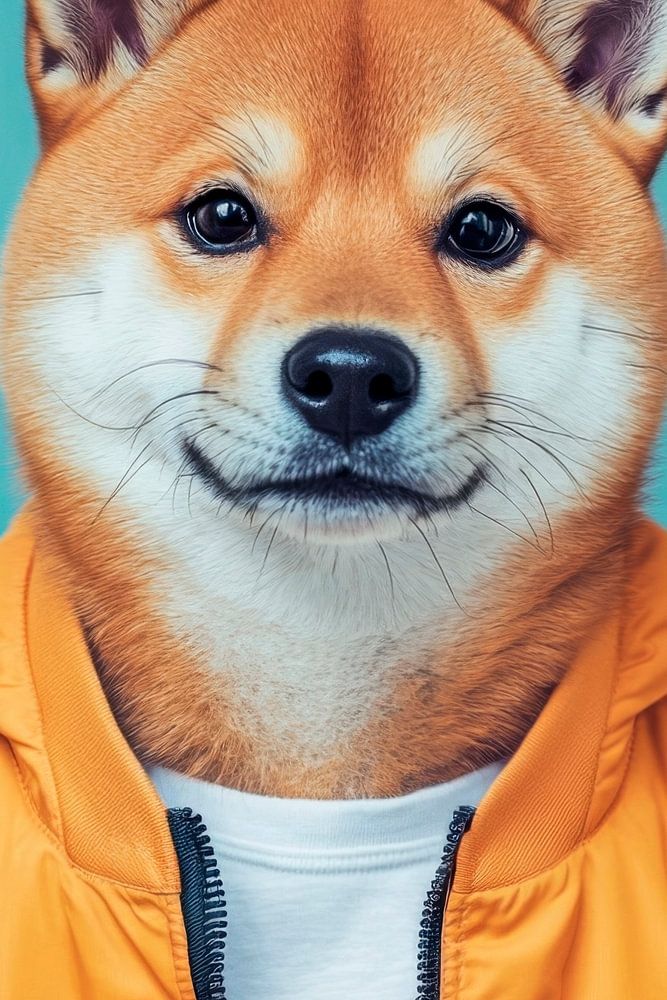 Ein Shiba Inu mit einem charmanten Grinsen und lebhaftem, seidigem Fell strahlt eine unverwechselbare Persönlichkeit aus. In einer stylischen, leuchtend orangefarbenen Jacke, kombiniert mit einem lässigen Weiß, verkörpert er den perfekten Mix aus Coolness und Loyalität. Sein neugieriger Blick verleiht dem Bild eine verspielte Note, die schlichtweg unwiderstehlich ist.