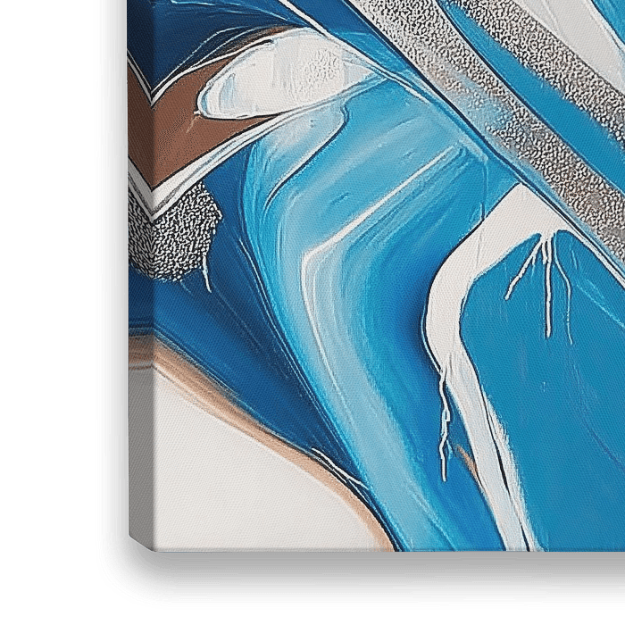 Silver Streaks Swirl - Dieses abstrakte Gemälde zeigt ein dynamisches Wechselspiel zwischen Blau- und Weißtönen, das durch erdige Linien und silberne Akzente akzentuiert wird.
