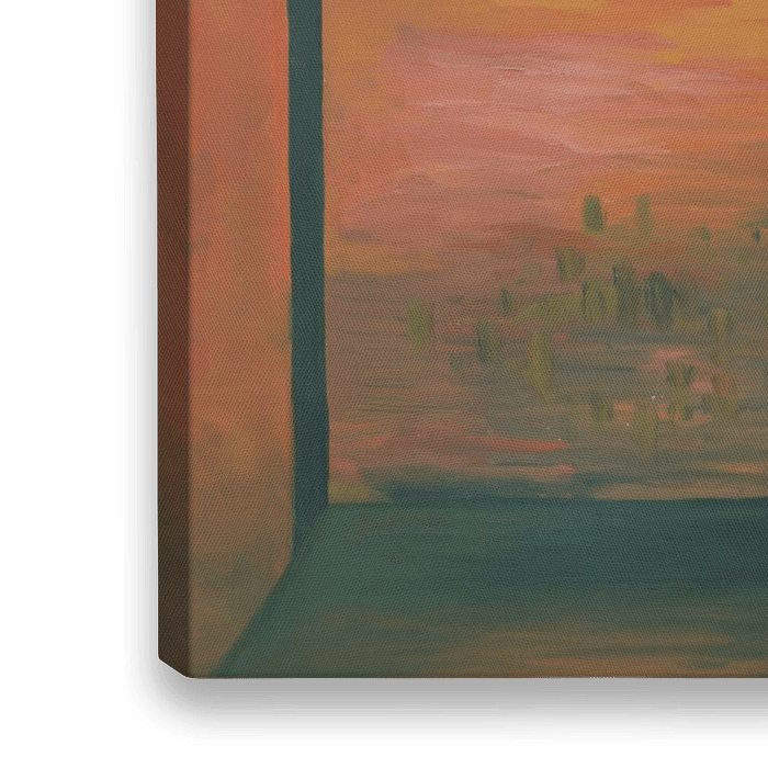 Dieses Ölgemälde zeigt die Silhouette einer Frau, die mit einem Kleidungsstück über dem Arm zu gehen scheint. Die Frau geht durch ein großes Tor, hinter dem sich vage die Umrisse einer Stadt abzeichnen. Das Gemälde enthält nur zwei Hauptfarben: Schwarz für die Frau und das Tor und verschiedene Orange-Töne für den Himmel und die Stadt. Das Orange verleiht dem Gemälde eine warme Atmosphäre, die den Eindruck erweckt, dass die Frau im Abendlicht spazieren geht. Das Original wurde auf einer 50x60 cm großen Leinwand gemalt.