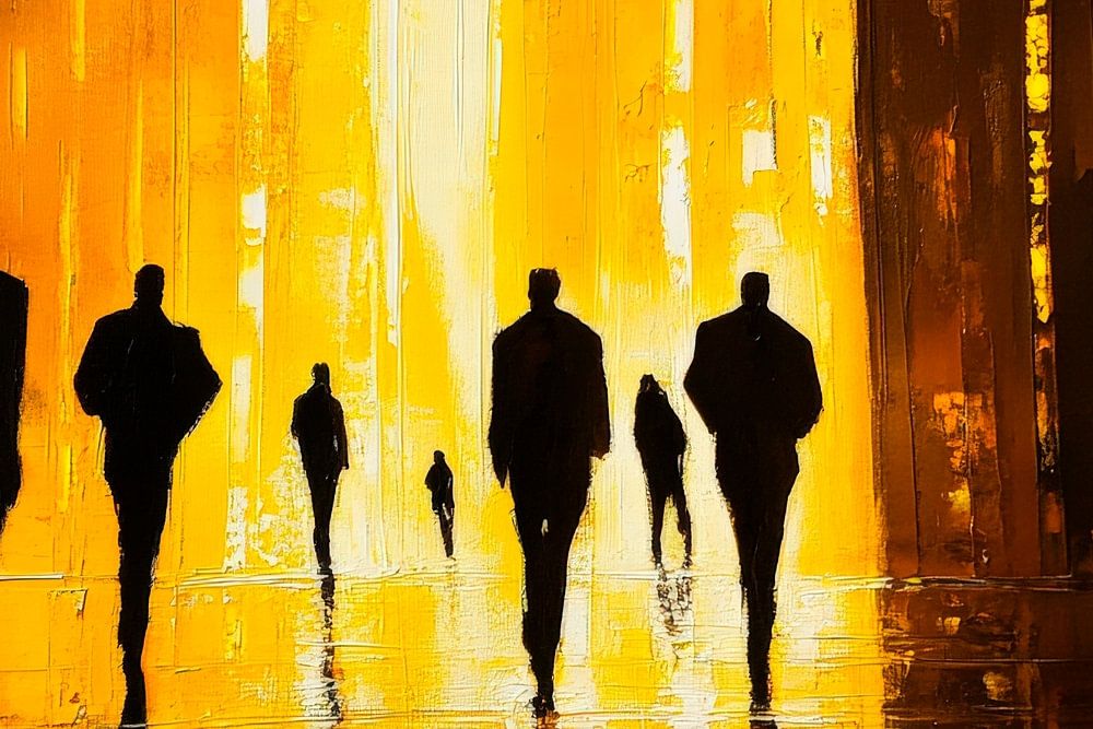 Ein faszinierendes Spiel aus Licht und Schatten entfaltet sich in dieser dynamischen Szene, wo silhuettierte Figuren sich in ein strahlendes, goldenes Lichtwandeln. Die warmen, leuchtenden Farben verleihen dem Raum ein Gefühl von Energie und Bewegung, perfekt für ein modernes Wohnzimmer, das Einladung zur Kreativität und Geselligkeit bietet.