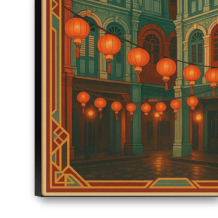 Bestelle dieses Landschafts-Wandbild Singapur Straßenszene Poster - Vintage Chinatown Ecke & Laternen von Travel Shop als Reproduktion auf Leinwand, Alu-Dibond, als Poster, Fototapete oder Acrylglasbild.