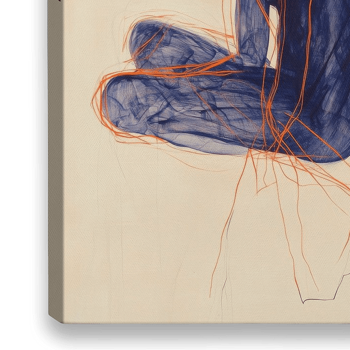 Eine melancholische Stille umweht die kontemplative Figur, umhüllt von sanften, fließenden Linien in tiefen Blau- und Orangetönen. Diese harmonische Komposition strahlt Ruhe und Nachdenklichkeit aus, perfekt für ein Schlafzimmer oder einen meditativen Raum, um eine Atmosphäre der Entspannung und Selbstreflexion zu fördern.