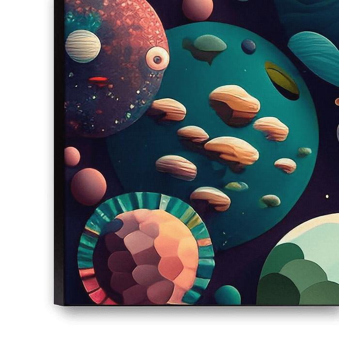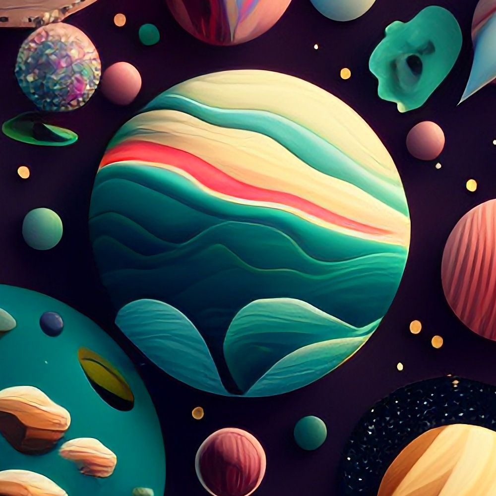 Diese lebendige kosmische Illustration zeigt eine reizvolle Sammlung von Himmelskörpern, von denen jeder einzigartig mit fantasievollen Farben, Texturen und Mustern gestaltet ist. Planeten mit wirbelnden Wolken, glühenden Ringen und phantastischen Oberflächen schweben vor einem tiefen Weltraumhintergrund und wecken ein Gefühl von Staunen und Kreativität. Der skurrile Stil und die reiche Farbpalette machen dieses hochauflösende Kunstwerk zu einem Blickfang für Weltraumfans, Kinderdekoration oder jeden, der sich für spielerische Interpretationen des Universums interessiert.