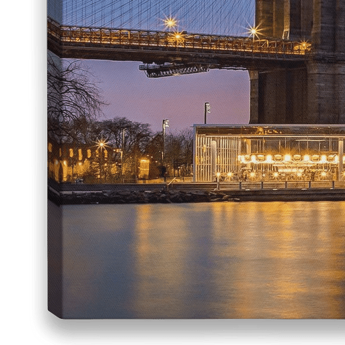 Die abends beleuchtete Skyline von Manhattan von Brooklyn aus gesehen, mit der Brooklyn Bridge und dem East River im Vordergrund.