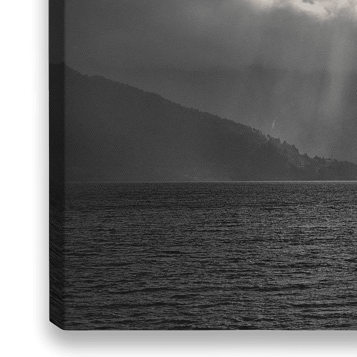 Sonnenharfen in Norwegen. Ein fast schwarz-weißes Bild von dramatischen Wolkenwänden über einem Fjord. Alle möglichen Grautöne bringen dennoch Farbe in dieses Landschaftsfoto. Das Foto wurde im Westen Norwegens aufgenommen, in der Fjordlandschaft unterhalb von Ålesund.