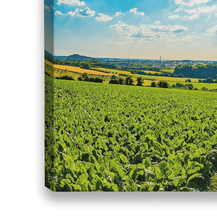 Sommerlandschaft mit einer Landstraße neben einem Getreidefeld bei strahlendem Sonnenschein