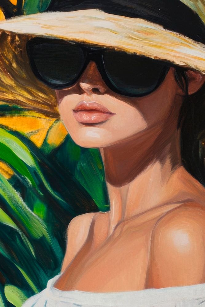 Inmitten lebendiger Palmen und glühender Sonnenstrahlen strahlt die Eleganz einer jungen Frau. Ihr breiter Sonnenhut und die großen, dunklen Sonnenbrillen verleihen ihr einen Hauch von Geheimnis. Das lockere, weiße Oberteil umschmeichelt ihre Schultern und schafft eine harmonische Verbindung zur tropischen Kulisse, voller Leben und Farbe.