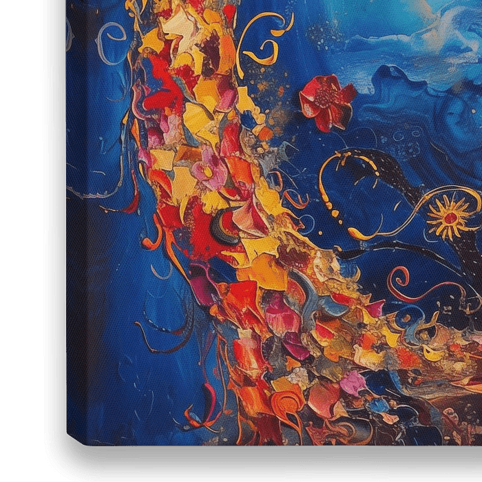 Abstraktes Gemälde mit Sonne und Blumen bei Nacht, das jedem Raum einen Hauch von Luxus verleiht. Mit seinem einzigartigen und stilvollen Aussehen ist es ein echter Blickfang. Die schönen Farben und das ungewöhnliche Design machen dieses Kunstwerk absolut einzigartig und originell. Es ist der perfekte Fotodruck, um Ihr Interieur zu…