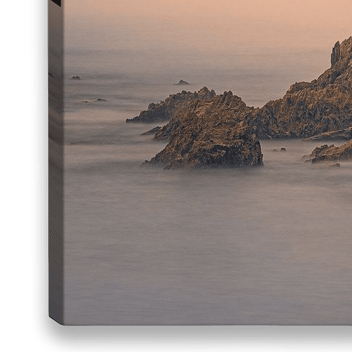 Ein 2:1-Foto von einem nebligen Sonnenaufgang am Strand von Gueirua, einer kleinen Kieselbucht, die durch ihre schöne Landschaft besonders auffällt.