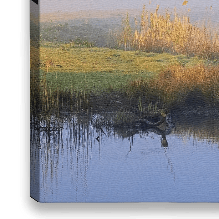 Ein Frühlingsmorgen mit einer Nebelschicht über dem Wasser und einem schönen Sonnenaufgang im 16:9-Format in Tusschenwater, einem Naturschutzgebiet in der Gemeinde Tynaarlo in der niederländischen Provinz Drenthe. Tusschenwater liegt östlich von Zuidlaren und südlich von De Groeve. Das Gebiet liegt im nördlichen Teil des Tals des…