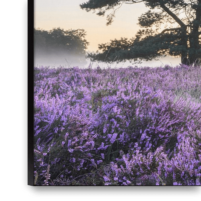 Bestelle dieses Landschafts-Wandbild Sonnenaufgang über blühender Heide im Naturschutzgebiet Veluwe im Sommer von Sjoerd van der Wal Fotografie als Reproduktion auf Leinwand, Alu-Dibond, als Poster, Fototapete oder Acrylglasbild.