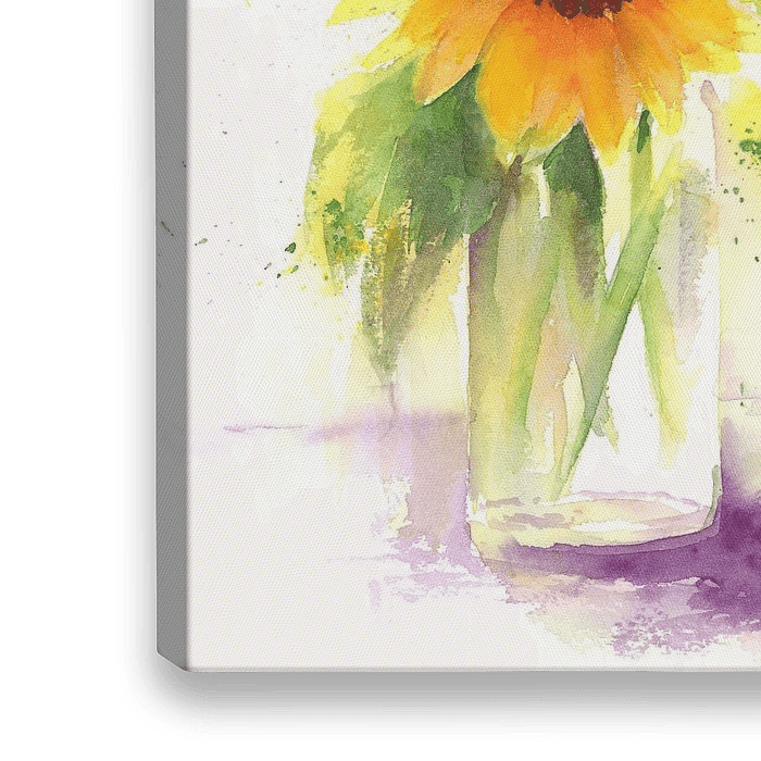 Sonnenblumen Stillleben mit Glasvase ist ein Aquarellgemälde im Hochformat der Künstlerin Karen Kaspar. Es zeigt ein Stillleben mit drei wunderschönen Sonnenblumen in einer Glasvase in leuchtenden Gelb-, Orange-, Grün- und Lilatönen.