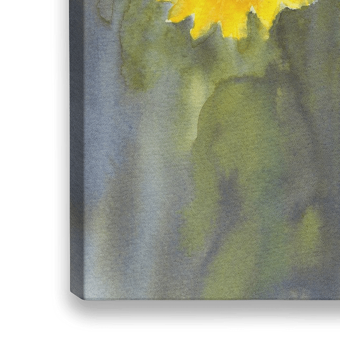 Die warmen gelben Blütenblätter kontrastieren mit den kühleren Grün- und Blautönen des Hintergrunds und schaffen eine lebendige und leuchtende Komposition.