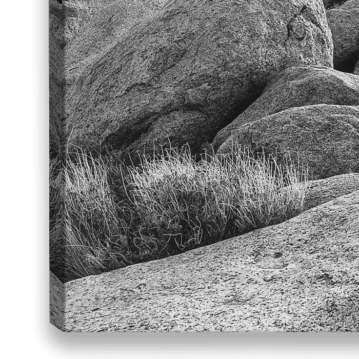 Felsbrocken bei Sonnenuntergang mit der Sierra Nevada-Gebirgskette im Hintergrund, gesehen von Manzanar im Osten Kaliforniens, Vereinigte Staaten.