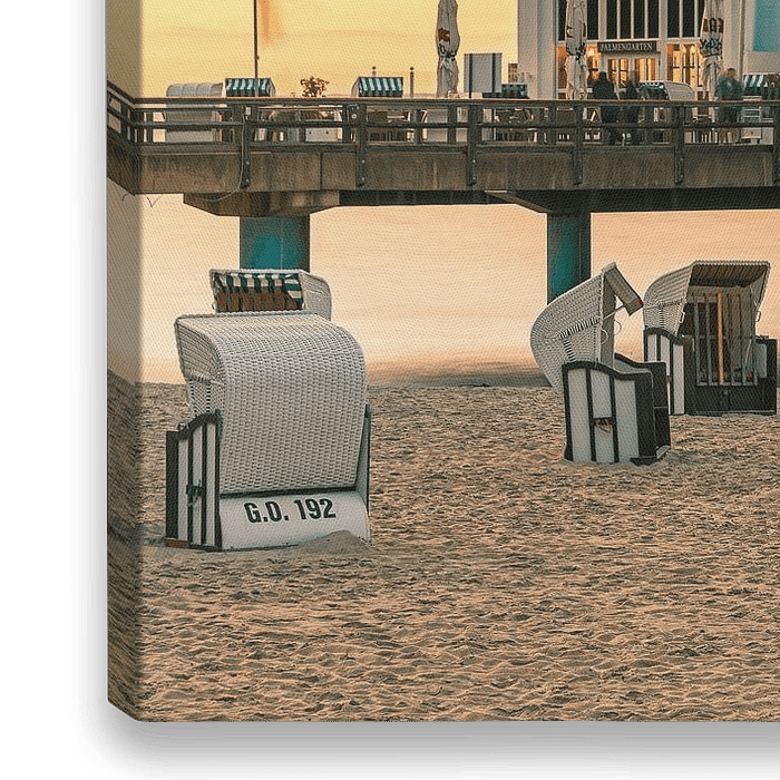 Sonnenuntergang am Strand und an der Seebrücke von Sellin mit dem berühmten Restaurant Seebrucke, auf der Halbinsel Rügen an der Ostsee in Mecklenburg-Vorpommern, Deutschland.