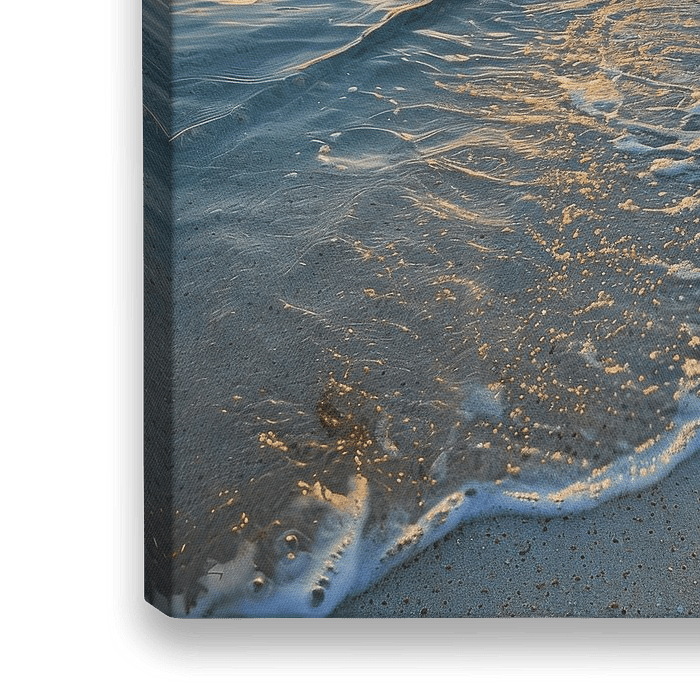 Das Bild zeigt einen malerischen Sonnenuntergang über einem ruhigen Meer, dessen sanfte Wellen den feinen Sandstrand umspielen. Die warmen Farben des Himmels – lebhafte Orange- und Gelbtöne – reflektieren sich im Wasser und schaffen eine harmonische Atmosphäre. Stimmungsvolle Wolken ergänzen die Szenerie und laden zur Entspannung ein.