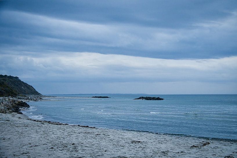 Bestelle das Foto Sonnenuntergang an der dänischen Küste. Strand, Wellen. Hügel mit Bäumen im Hintergrund. Landschaft. von Martin Köbsch als Reproduktion auf Leinwand, Alu-Dibond, als Poster, Fototapete oder Acrylglasbild.