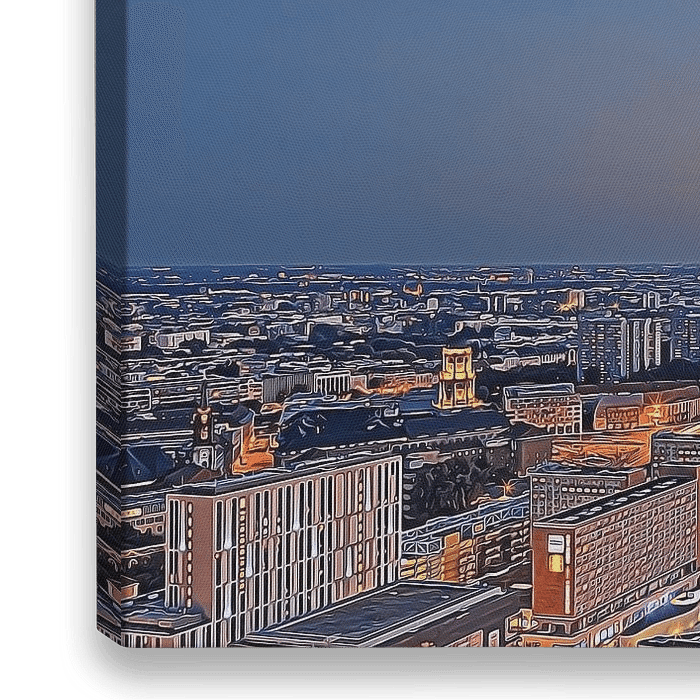 Eine digitale Ölgemäldebearbeitung eines Sonnenuntergangs in Berlin am Berliner Fernsehturm. Der Fernsehturm steht im Zentrum des ehemaligen Ost-Berlins am Alexanderplatz, Deutschland.