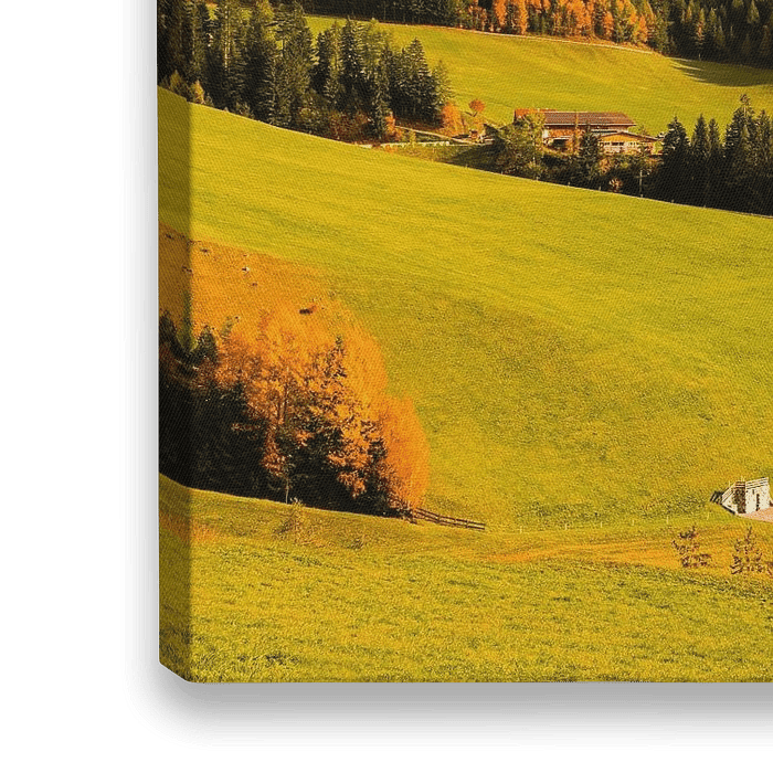 Ein Bild von einem Sonnenuntergang mit Herbstfarben in einer der vielleicht berühmtesten Landschaften der Dolomiten, der Kirche und dem Dorf Santa Maddalena vor den Geisler- oder Geisel-Dolomitengipfeln im Val di Funes, in der italienischen Provinz Südtirol in den Dolomiten.