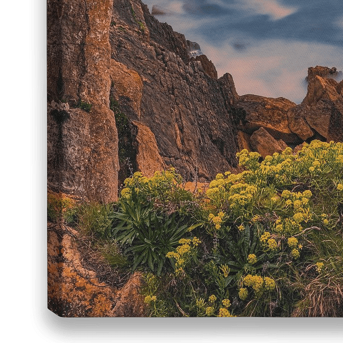 Ein vertikales 4:5-Foto eines Sonnenuntergangs bei den Felsformationen von Urro del Manzano mit Blick auf den Golf von Biskaya.