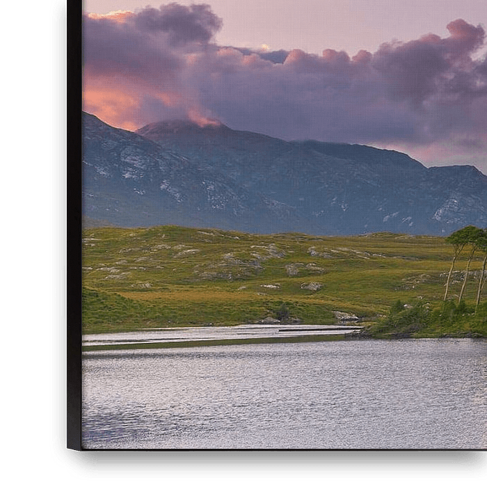 Bestelle dieses Landschafts-Wandbild Sonnenuntergang in der Connemara am Derryclare Lough, Irland von Henk Meijer Photography als Reproduktion auf Leinwand, Alu-Dibond, als Poster, Fototapete oder Acrylglasbild.