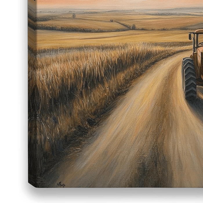 In sanften Farben erstrahlt der Himmel bei Sonnenuntergang, während sich ein einsamer Traktor über den kurvenreichen Feldweg schlängelt. Goldene Ähren wiegen sich im Wind und spiegeln die Ruhe des ländlichen Lebens wider. Diese Szenerie lädt ein, den Alltag hinter sich zu lassen und die Schönheit der Natur zu genießen.
