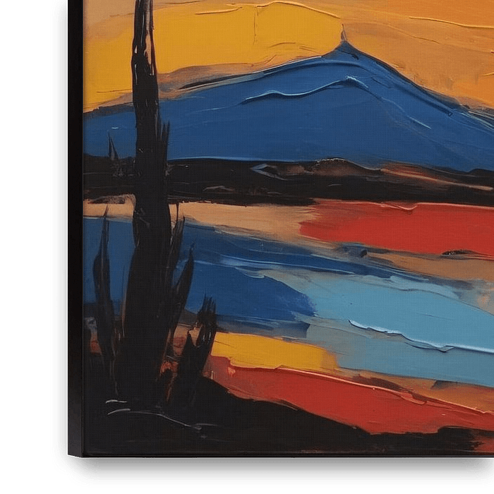 Tauchen Sie ein in die hypnotisierende Schönheit dieser impressionistischen Interpretation der letzten Lichtstrahlen des Tages. Die Leinwand erwacht durch die lebendigen Pinselstriche, die die untergehende Sonne und das sich spiegelnde Wasser einfangen, zum Leben und schafft eine Oase der Farbe, die den Raum mit ihren orangefarbenen,…