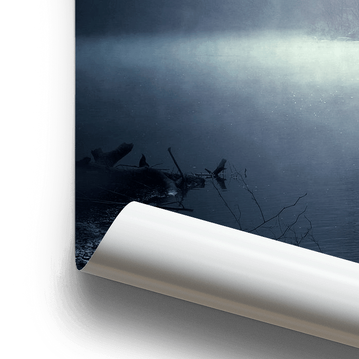 Eine ruhige und neblige Flusslandschaft fängt einen schrägen Baum ein, der sich im stillen Wasser spiegelt. Dämmeriges Licht dringt durch den Nebel und schafft eine geheimnisvolle und ätherische Atmosphäre. Die Szene ruft eine friedliche und doch unheimliche Stimmung hervor, in der sich die Eleganz der Natur mit Stille verbindet.