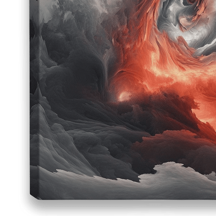 Dieses Kunstwerk zeigt eine gewaltige Spirale aus wirbelnden Wolken und flammenartigen Strukturen. Die Farbpalette aus Schwarz, Rot und Grau erzeugt eine dramatische und mystische Atmosphäre. Die Spiralbewegung zieht den Betrachter in das Zentrum des Geschehens und vermittelt ein Gefühl von endloser Energie und Dynamik. Ideal für Räume,…