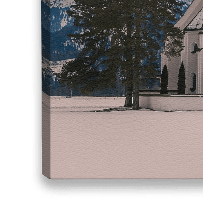 Winter und Sonnenuntergang an der St. Coloman Kirche, in der Nähe von Hohenschwangau mit den deutschen Alpen im Hintergrund, in der Nähe von Füssen, im Allgäu, in Bayern, Süddeutschland.