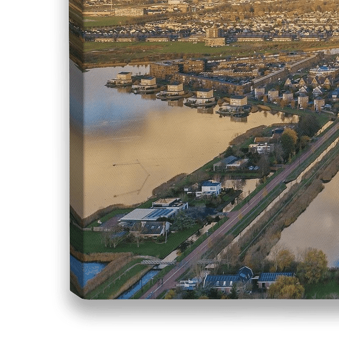 Das Wohngebiet Stad van de Zon von oben gesehen. Das Niedrigenergie-Wohngebiet mit Sonnenkollektoren im Süden von Heerhugowaard in der Nähe von Alkmaar.
